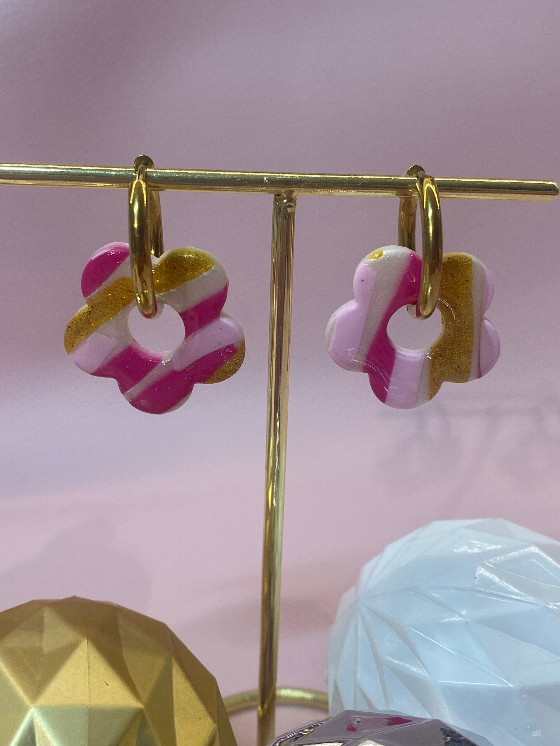 Ces petites fleurs en pâte polymère mélangent des bandes de rose, blanc nacré et doré pailleté pour un look sucré et lumineux. Accrochées à de fines créoles dorées, elles apportent une touche pop et rétro à toutes vos tenues.