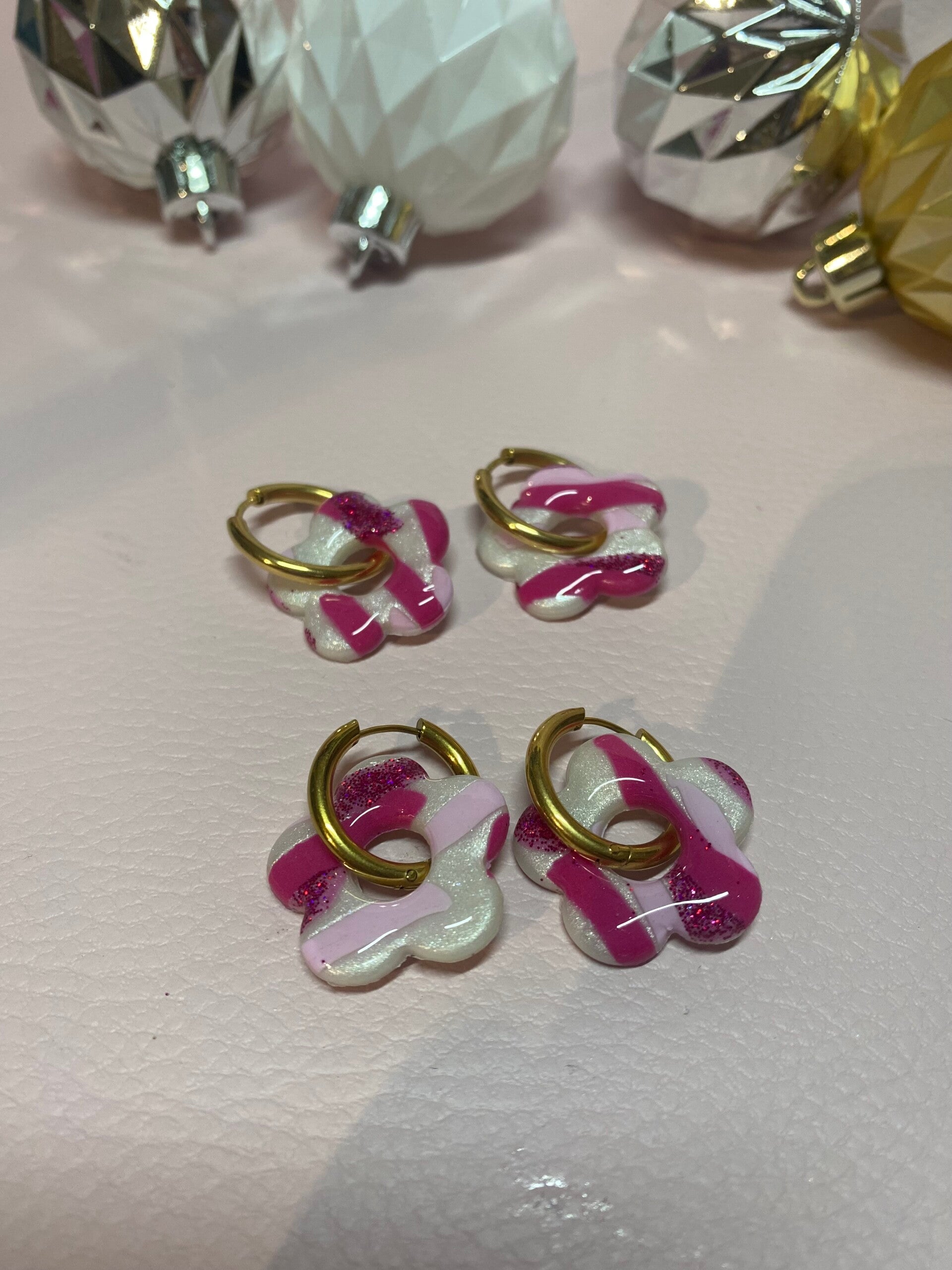 Un mélange crémeux de blanc nacré, de roses tendres et de touches pailletées, pour un bijou à la fois délicat et joyeusement pop.